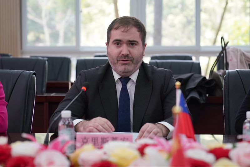 克里斯蒂安·戴维斯总领事对学校的热情接待表示感谢,高度评价了我校在外语人才培养方面取得的成果。他指出,教育与文化交流是连接国家与人民的重要纽带,西班牙语作为中智沟通的关键桥梁,在促进双方理解与合作中发挥着不可替代的作用。他强调,青年学生是中智关系的未来,希望同学们通过语言学习不断深化对彼此文化的认知,成为推动两国友好事业的重要力量。智利驻成都总领事馆愿与学校进一步拓展合作领域:一是继续设立实习生岗位,每年接收我校学生赴领馆实习;二是推动摄影展、电影节等文化活动合作,探索联合举办机制;三是搭建与智利高校的交流平台,推进友好学校关系建设、交换生项目及教师互访;四是积极对接智利政府及相关机构,拓展更多合作资源。他表示,总领馆将积极协调智利方面的资源,推动各项合作事项落地落实,期待在双方共同努力下,持续推广西班牙语及拉美文化,促进学术教育与经贸交流深度融合。